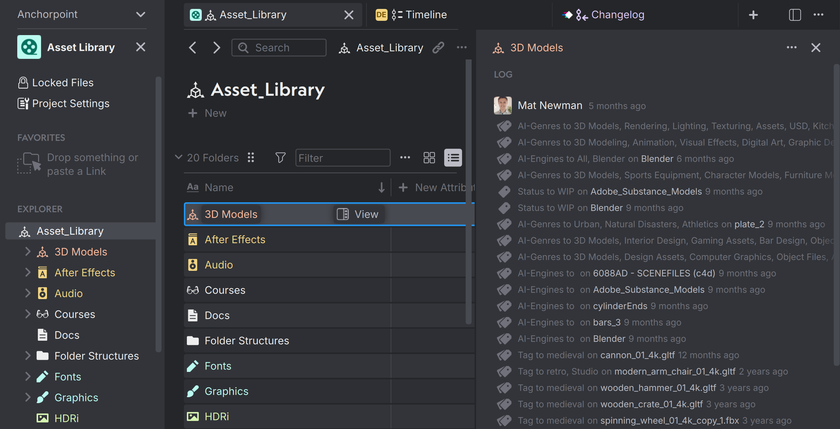 Attribute changes are automatically logged and displayed in the sidebar. These logs help you track who made specific modifications — for example, identifying that the art lead marked an asset as “approved.” The log also records when team members unlock files that were previously locked by someone else. This can be necessary in cases where a user has locked files but forgotten to push or unlock them, such as when leaving the company or going on vacation.